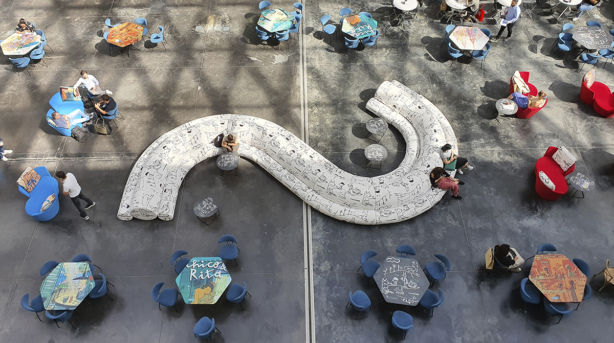 The piece was upholstered with one of the new black-and-white prints designed by Javier Mariscal, bringing a strong visual character to the space. Around it, several tables decorated with different prints from the collection were arranged, creating a dynamic setting that was easily recognisable along the fair’s main route.