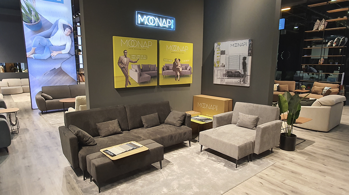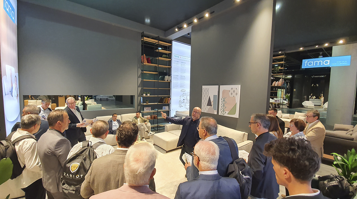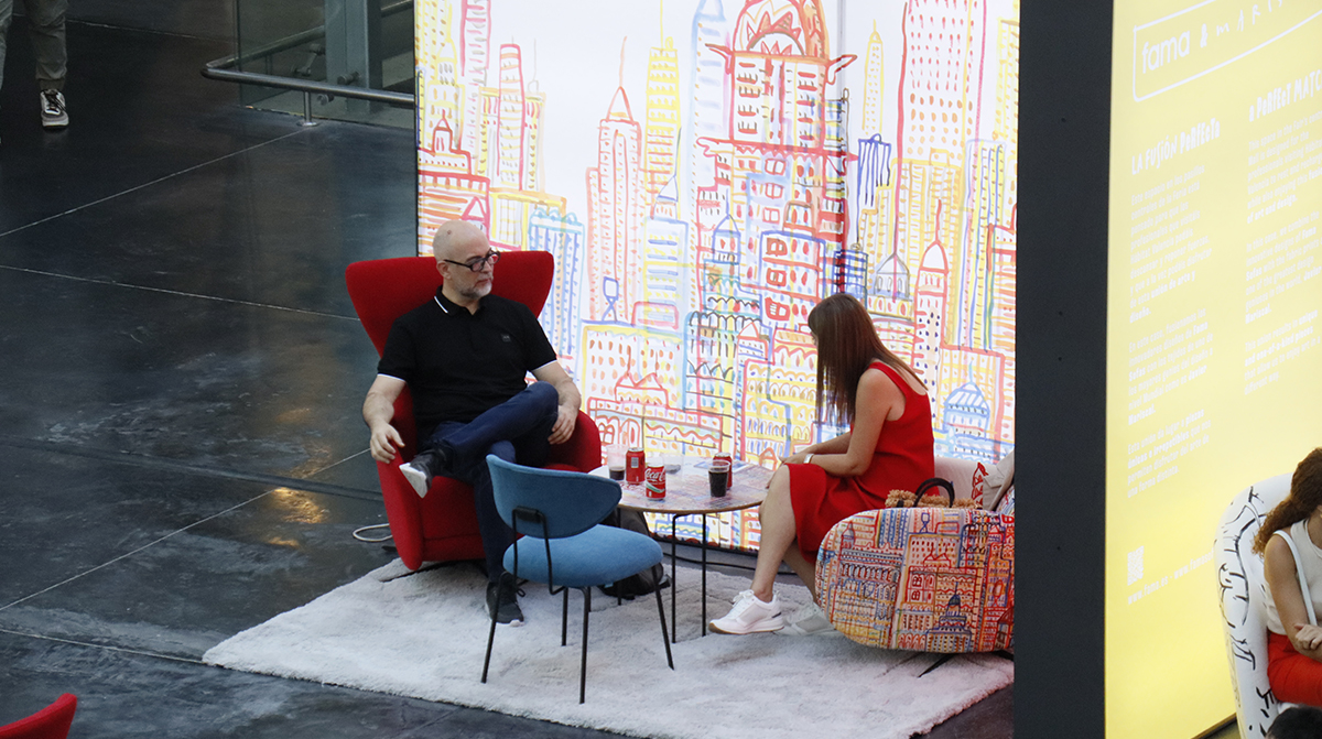 Fama also left its mark in the central aisles of Feria Valencia with the installation of a striking upholstered bench in an “S” shape, designed as a meeting and resting point for visitors.